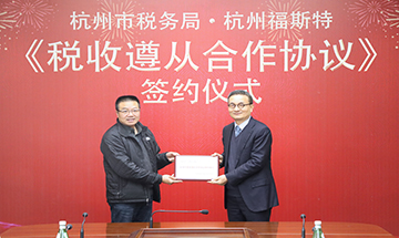 福斯特與杭州市稅務(wù)局續(xù)簽《稅收遵從合作協(xié)議》 [2022-01-14][2022-01-14]2022年1月13日上午,杭州市稅務(wù)局與福斯特《稅收遵從合作協(xié)議》簽約儀式在公司隆重舉行。國(guó)家稅務(wù)總局杭州市稅務(wù)局黨委委員、副局長(zhǎng)申屠水路領(lǐng)導(dǎo)一行,董事長(zhǎng)林建華出席簽約儀式。[查看詳情]