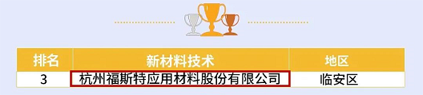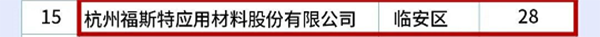 受浙江省高新技術企業(yè)協(xié)會委托,浙江省科技信息研究院組織開展高新技術企業(yè)創(chuàng)新能力評價工作。通過多指標的綜合對比,評選出2020年浙江省高新技術企業(yè)創(chuàng)新能力百強,福斯特排名28。此外,在新材料技術榜單十強榜單中,福斯特成為全市唯一入選企業(yè)。