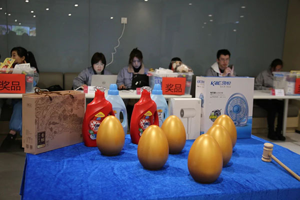 工作人員提前布置場地,在食堂的休息區(qū)掛上了滿滿的燈謎,隨著午餐后“活動開始”的一聲令下,大家蜂擁而至,在燈謎區(qū)苦苦思索和尋找??吹侥懿鲁龅臒糁i,便立馬拿下,沖向兌獎區(qū)兌換小禮品,同時增加積分。隨著燈謎越來越少,活動也逐漸進入了高潮。最終,六名選手脫穎而出,獲得了砸金蛋的機會,最多的一位猜出了九條燈謎。砸金蛋,得大獎,公司為大家準(zhǔn)備了吹風(fēng)機、電風(fēng)扇等獎品。