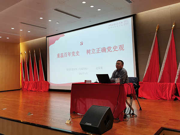課上,沈榮胤老師首先為我們講解了中國(guó)共產(chǎn)黨百年黨史的發(fā)展歷程,并以如何學(xué)習(xí)、認(rèn)知并確立正確的黨史觀為核心,繪聲繪色地向大家講述了正確學(xué)習(xí)、認(rèn)知黨史的重要性,贏得了大家的熱烈掌聲。