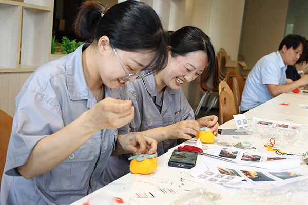 萋萋苦艾納香囊,傳承千年未泯香。我國自古就有端午佩戴香囊的傳統(tǒng),清香的艾葉有避邪驅瘟、醒腦提神的功效,也有“招百?!钡拿篮迷⒁?。員工們自己動手縫制柿子形狀的香囊,象征“柿柿如意”,大家全神貫注,穿線、縫制、收口、定型,一個個可愛的小柿子就在手中誕生了。