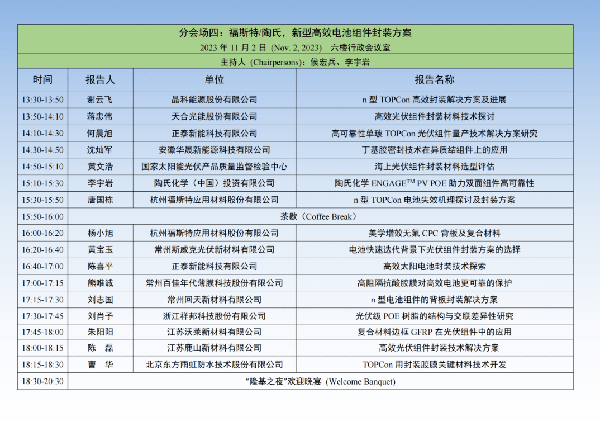 同時(shí)福斯特作為CSPV協(xié)辦單位,將于11月2號(hào)下午組織關(guān)于封裝方案的專(zhuān)題論壇。分會(huì)場(chǎng)四:福斯特/陶氏,新型高效電池組件封裝方案,和行業(yè)同仁探討行業(yè)技術(shù)對(duì)封裝方案的要求。