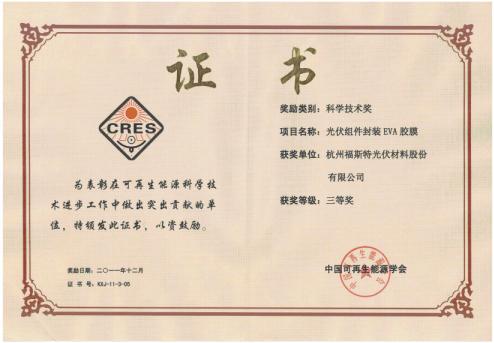 福斯特的“光伏組件封裝EVA膠膜”項(xiàng)目獲得中國(guó)可再生能源學(xué)會(huì)的“科學(xué)技術(shù)獎(jiǎng)”。