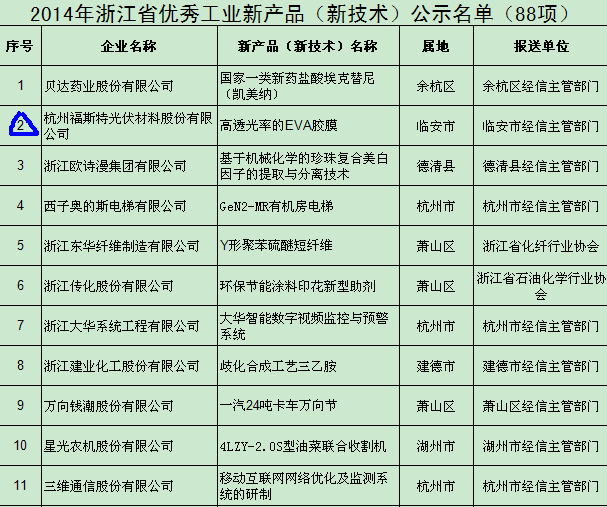 經(jīng)過初審并組織專家進行評審,經(jīng)核準評定,共有88個項目擬定為2014年浙江省優(yōu)秀工業(yè)新產(chǎn)品(新技術),其中杭州福斯特光伏材料股份有限公司的高透光率的EVA膠膜順利入圍。