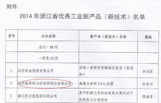 日前,浙江省經(jīng)信委、財(cái)政廳聯(lián)合下發(fā)《關(guān)于公布2014年浙江省優(yōu)秀工業(yè)新產(chǎn)品(新技術(shù))名單的通知》,福斯特產(chǎn)品“高透光率的EVA膠膜”榮獲一等獎,再次奠定了福斯特在光伏封裝材料領(lǐng)域的行業(yè)領(lǐng)先地位。