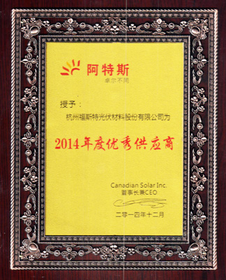 福斯特榮獲阿特斯授予的2014年度優(yōu)秀供應(yīng)商榮譽(yù)稱(chēng)號(hào)