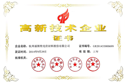 高新技術(shù)企業(yè)是政府和社會對福斯特在光伏材料封裝領(lǐng)域科研創(chuàng)新領(lǐng)域成果轉(zhuǎn)化能力的認(rèn)可,也是公司堅持“創(chuàng)新技術(shù)為明天”理念的充分體現(xiàn),為公司發(fā)展提供了更優(yōu)惠的政策和更廣闊的舞臺。