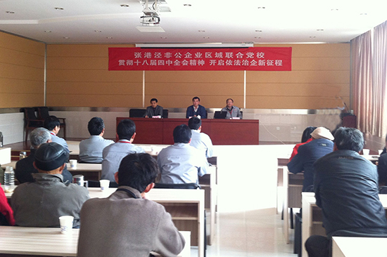 4月9日下午,張港涇村非公企業(yè)聯(lián)合黨校黨課教育活動(dòng)在蘇州福斯特舉行。活動(dòng)特邀常熟市委黨校高級(jí)講師邵鐳以“貫徹十八屆四中全會(huì)精神,開(kāi)啟依法治企新征程”為主題作專題講座,村黨委全體黨員和轄區(qū)企業(yè)黨員干部共90多人參加了本次活動(dòng)。