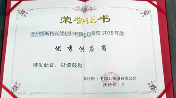 2016年開年之際,福斯特再獲佳績。1月20日,蘇州福斯特光伏材料有限公司應(yīng)邀參加阿特斯年度供應(yīng)商頒獎(jiǎng)活動(dòng),并榮獲阿特斯2015年度優(yōu)秀供應(yīng)商。