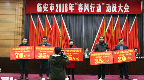 2016年1月12日下午,臨安市“春風(fēng)行動”正式啟動。啟動儀式上,福斯特與另外三家企業(yè)率先捐款,其中,福斯特本次捐款35萬元。今年是福斯特參與我市“春風(fēng)行動”的第5個年頭,累計捐款金額已達120萬元。