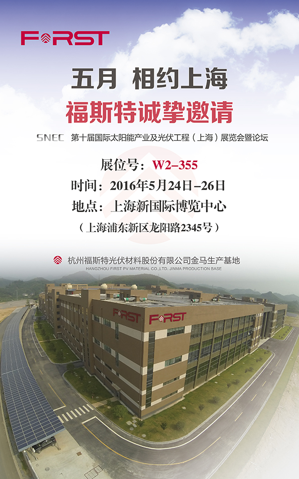 福斯特,全球領(lǐng)先的EVA太陽能膠膜、烯烴膠膜、背板材料供應(yīng)商,誠摯邀您參加2016上海SNEC展會。福斯特展位號:W2-355,時間2016年5月24日-26日,地點:上海新國際博覽中心(上海浦東新區(qū)龍陽路2345號)。期待您的光臨!