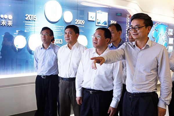 浙江省委副書記、省長李強(中),杭州市委副書記、市長張鴻銘(右)在福斯特董事長林建華的陪同下參觀新材料研究院