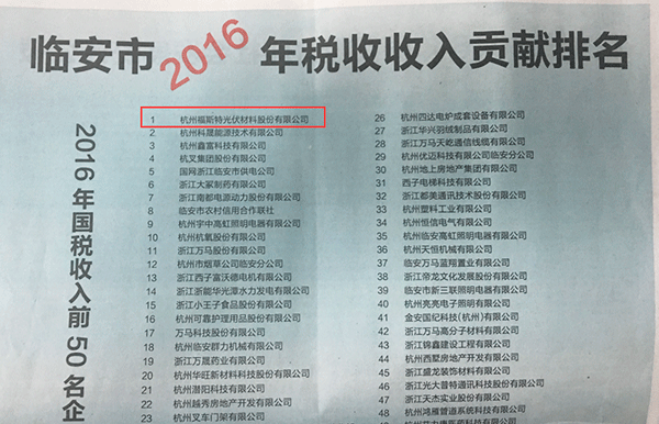 4月7日,2016年全市工業(yè)和信息經(jīng)濟(jì)大會(huì)在臨召開。會(huì)上,福斯特榮獲市大企業(yè)大集團(tuán)二十強(qiáng),工業(yè)銷售產(chǎn)值上臺(tái)階企業(yè)——新上30億企業(yè),工業(yè)畝均績(jī)效優(yōu)秀企業(yè),十強(qiáng)外貿(mào)企業(yè)等多項(xiàng)榮譽(yù)。浙江省福斯特新材料研究院獲省級(jí)重點(diǎn)企業(yè)研究院授牌。2016年,福斯特為我市工業(yè)經(jīng)濟(jì)發(fā)展做出了重要貢獻(xiàn),公司連續(xù)多年位列市國(guó)稅稅收貢獻(xiàn)排名第一位。