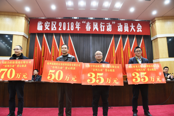 “春風(fēng)行動(dòng)”自2001年啟動(dòng)以來(lái),已經(jīng)成為傳遞社會(huì)正能量,普惠困難群體的暖心工程、民心工程和德政工程。1月4日下午,臨安區(qū)2018年“春風(fēng)行動(dòng)”正式啟動(dòng)。啟動(dòng)儀式上,福斯特與臨安區(qū)另外3家企業(yè)率先捐款,其中,福斯特捐款50萬(wàn)元。區(qū)委、區(qū)政府領(lǐng)導(dǎo)也紛紛帶頭捐款,幫助困難群眾。