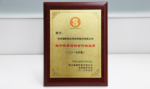 日前,福斯特榮獲錦州陽光能源控股有限公司、錦州陽光能源電池組件公司聯(lián)合頒發(fā)的2017年度組件優(yōu)秀材料合作供應商獎。
