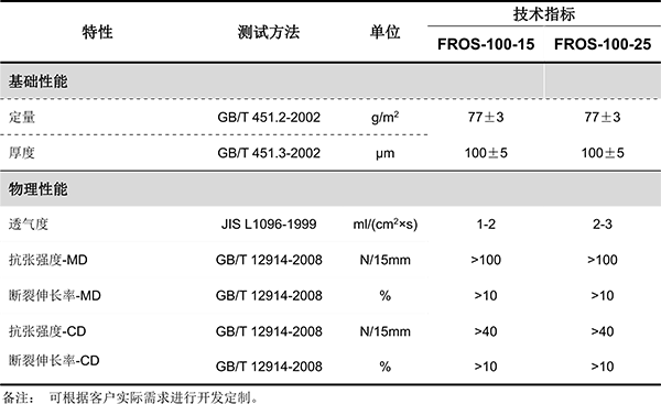 FROS系列是專為反滲透膜開發(fā)的支撐材料,產(chǎn)品具有優(yōu)異的均勻性和力學(xué)性能,克重、厚度均一,透氣度適中,可滿足反滲透膜的加工和使用要求。反滲透膜有不同的應(yīng)用場(chǎng)景,不同產(chǎn)品的加工工藝存在差別,FROS系列支撐材料的透氣度等指標(biāo)可進(jìn)行針對(duì)性的調(diào)整,最大程度匹配客戶的工藝,滿足差異化需求。